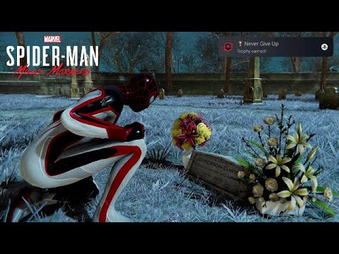 Miles Morales there is a Trophy called Never Give up which asks you to Pay respects at Jefferson Daviss grave Jefferson Davis is Miles dad who was killed in the 2018 game. In order to obtain this trophy you need to visit and and interact with Miless dads grave. This trophy can be obtained by visiting the grave of Miles late father Jefferson Davis.